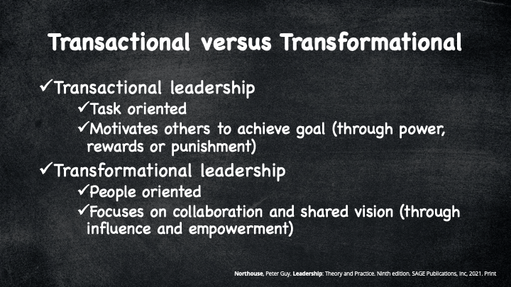 - Transactional Leadership: Managing routine tasks and maintaining high standards is important – but don’t forget that people are more important than tasks, and leadership is ultimately about people.